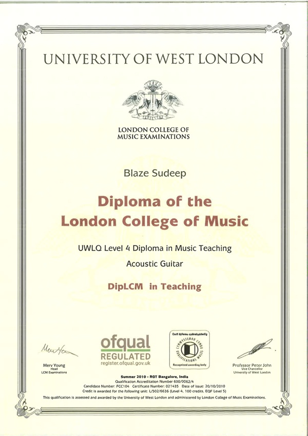 Armed with professional credentials from esteemed institutions such as the London College of Music, Trinity College of London, and Berklee College of Music, Blaze possesses a formidable arsenal of certifications in Western theory, guitar, saxophone, keyboard, and more. Yet, his journey into music education transcends mere accolades, delving deep into the realm of philosophy, where he earned a Master's degree from Dharwad University, enriching his pedagogy with a profound understanding of the human experience.